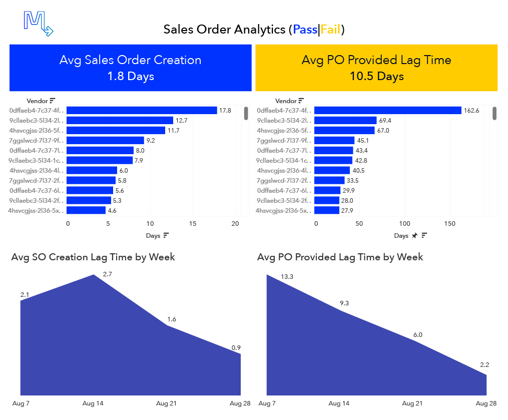 The next step in Order-to-Cash analytics after Usage Capture is the collection of the PO and creation of the sales order. The most important metrics to track are the lag times of these events relative to the surgery date (see Figure 5 below). Both med device manufacturers and hospitals are concerned with reducing these lag times to streamline the Order-to-Cash process. Movemedical tracks these lag times over different regions and/or vendors, and also over time, to monitor opportunities for improvement and progress.