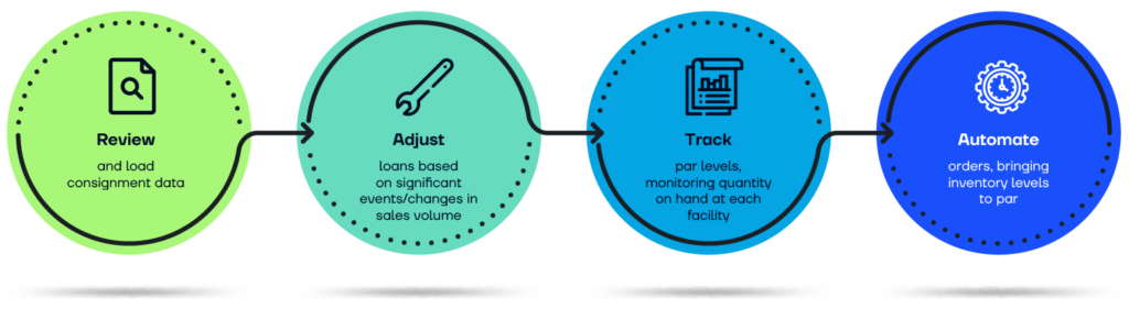 Once consignment loans are live, changes between the quantity on hand and the par level should be monitored in real time, and any shortages returned to par with automated restock orders.